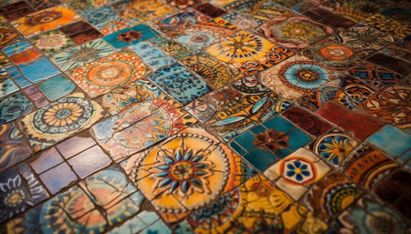 Close-up view of a vibrant mosaic tile floor. Rich colors and intricate patterns create a stunning display