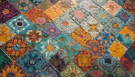 Vibrant Mosaic Artwork with Intricate Patterns and Cultural Elements for Creative Interior Design