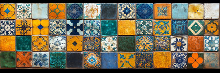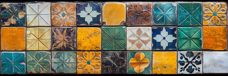 A vibrant arrangement of colorful vintage tiles showcases a rich mosaic pattern, ideal for backgrounds or decorative elements in design projects.