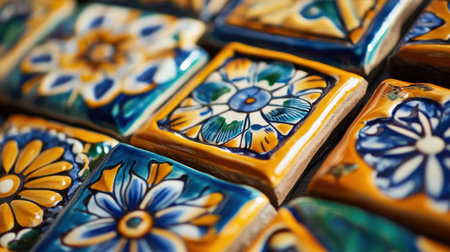A close-up view displays a variety of colorful ceramic tiles adorned with intricate patterns and designs, celebrating traditional artistry and vibrant colors.