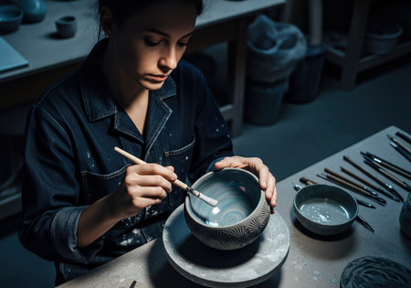 Focused young woman meticulously hand-painting the interior of a textured ceramic bowl with glaze in a pottery studio. The creative process highlights craftsmanship and artistic skill.