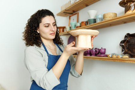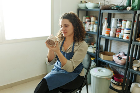 Female Ceramic Artist Inspecting Handcrafted Pottery in Studio