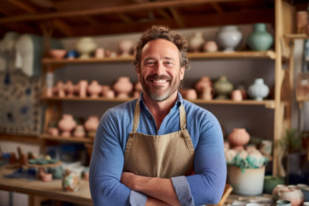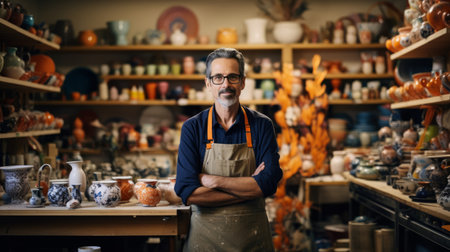 Portrait of smiling potter standing with arms crossed in pottery studio