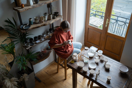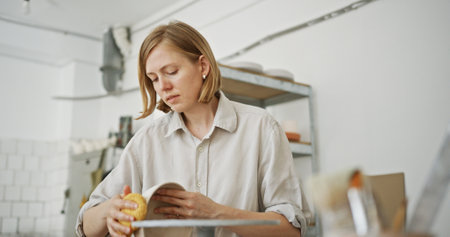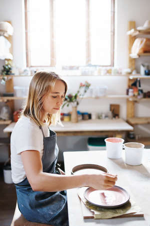 Concentrated creative ceramic woman sits at table and covers natural clay dishes with white lacquer