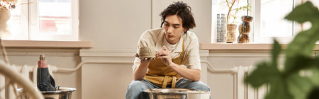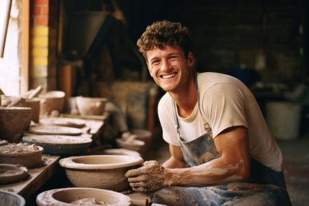 Confident young man making ceramic pot on the pottery wheel : Generative AI