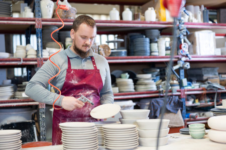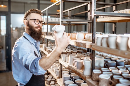Creative worker checking quality of the clay jugs at the warehouse with lots of ceramic products of the pottery shop