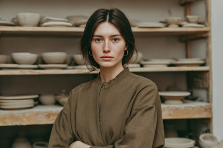 A young woman stands in a pottery studio, surrounded by shelves filled with various ceramic dishes. She looks directly at the viewer with a calm expression, her arms crossed.
