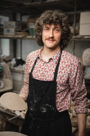 A bearded male artisan focused on crafting pottery, surrounded by shelves of clay pieces in a warm rustic workshop setting.