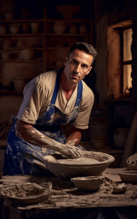 Artisan Shaping Clay Bowl Hands of a Potter in Rustic Workshop Ambience.
