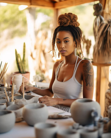 shot of a young woman working in a ceramics workshop, created with generative ai