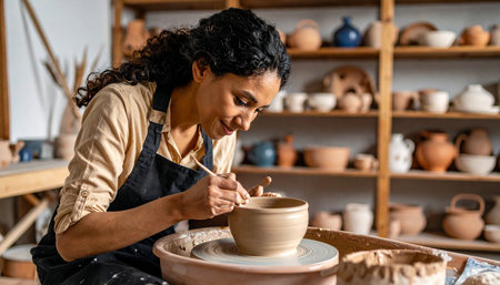 A focused woman potter, wearing an apron, concentrates on shaping a piece of wet clay on a spinning pottery wheel. Her hands are covered in clay as she skillfully forms a vase or pot in a rustic, sunlit art studio.