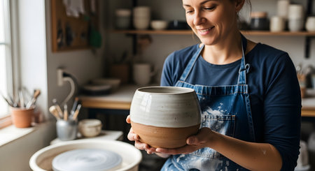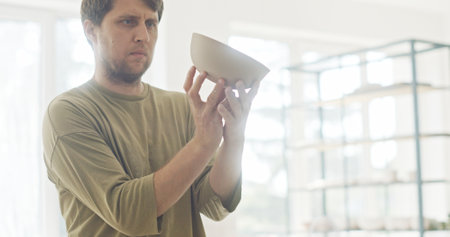 Craftsman Inspecting Newly Formed Ceramic Bowl in Bright Workshop