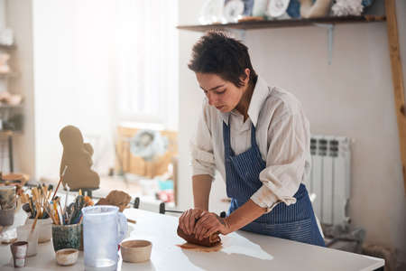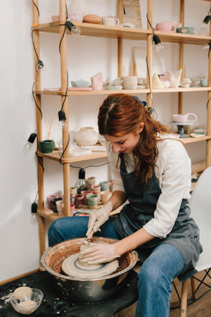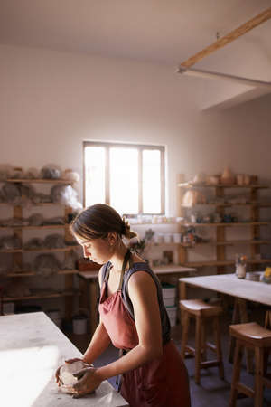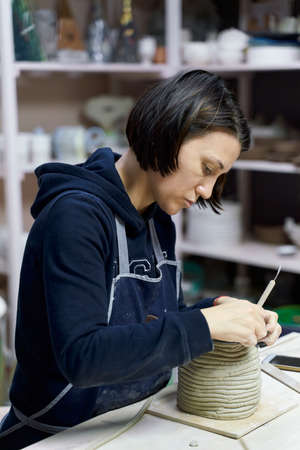 Female artist sculpts crafts with ceramic clay at her creative workshop. Mastering the art of pottery craft ceramics