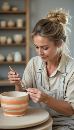 A skilled woman with blonde hair is meticulously painting a striped pottery bowl in a serene studio filled with handmade ceramics. Her focused expression and gentle touch highlight the artistry and passion behind her craft, creating a warm and inviting atmosphere.