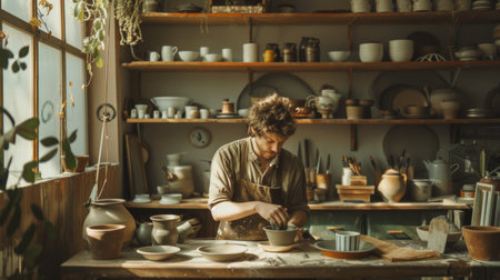 Artisan Crafting Pottery in Studio with Clay Bowls and Mugs.