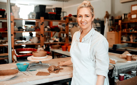 Small business, woman and happy at pottery store with clay as artist for supply and manufacturing. Startup, female person and proud on portrait with tools or equipment for creativity and design