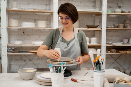Potter woman finishing a craft in her ceramic workshop. Hobby and craft concept.