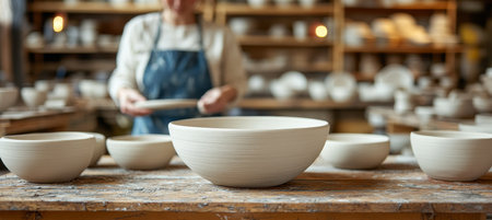 Ceramic Bowls Displayed on Workbench in a Pottery Studio, Blurred Potter in Background