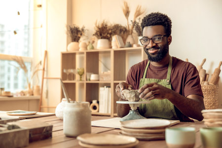 Pensive entusiastici potter in glasses at his own workshop is workig on a new handmade teapot.