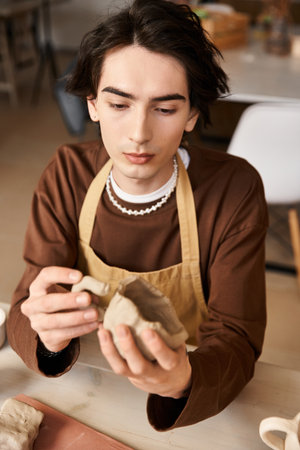 A young man skillfully works with clay in a pottery studio, showcasing his artistic talent.