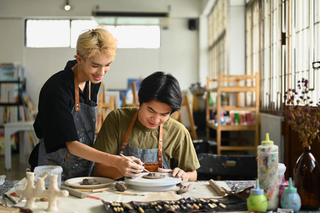 Pottery class and workshop: professional male potter working with kid and showing how to make ceramic wares in pottery studio. Handmade, education and study concept