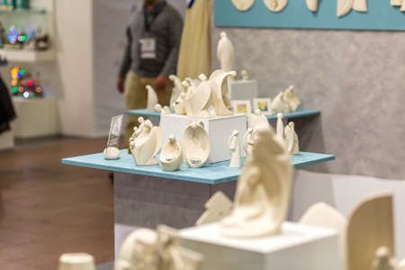 BOLOGNA, ITALY - FEBRUARY 18, 2019: lights are enlightening statues at stand of CENTRO AVE PAFOM in DEVOTIO Religious products and service exhibition