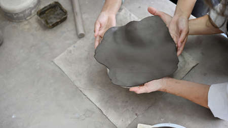 Top view, Two female making a clay pottery together, moulding clay with hands. Creative activities workshop concept.