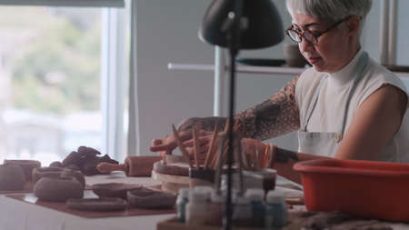 Asian elderly woman enjoying pottery work at home. A female ceramicist is making new pottery in a studio.