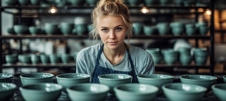 Woman Surrounded by Ceramic Bowls in Pottery Studio, Artistic Craft and Creativity Concept