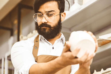 A young attractive male potter with a beard and mustache works in his workshop. Holds and inspects the finished product