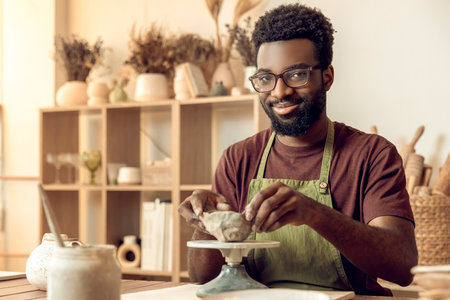 mixed race afro male potter with black apron sitting at workshop table potter