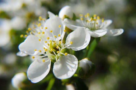 White flowers of an apple tree close-up. Petals, pistils, stamens, leaves and branches. Blooming fruit tree in spring. Illustration about the end of winter and the beginning of summer. Macro
