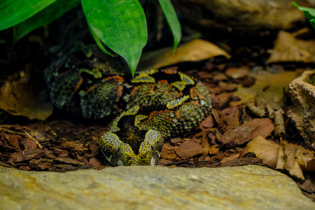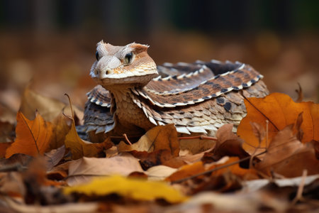 gaboon viper lunging at a bird from a pile of leaves, created with generative ai
