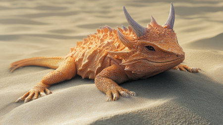 A horned lizard camouflaged in the desert sand, with its spiky appearance and keen eyes, demonstrating the defensive mechanisms of reptiles.