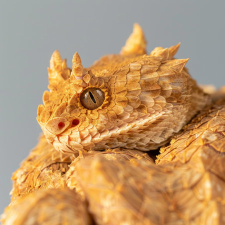 stunning reptile rests in a coiled position displaying its distinctive horns and intricate scale patterns illuminated by soft lighting to highlight its natural beauty.