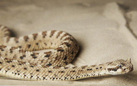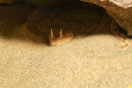 Close up Sahara horn viper in sand at the cave