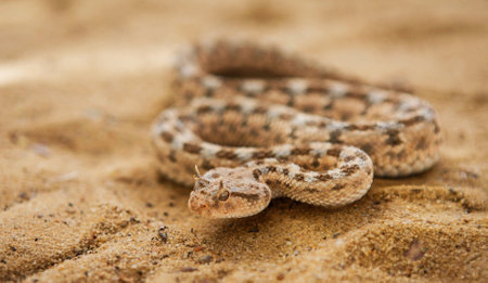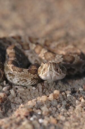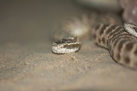 Close-up of a sabertooth rattlesnake on sand