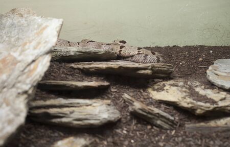 Rock rattlesnake (Crotalus lepidus) hidden behind slate in a glass display