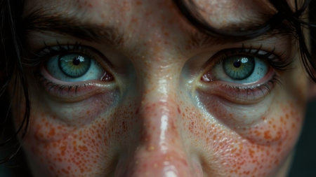 A young woman gazes directly at the viewer, her expressive blue-green eyes reflecting emotion. Soft light accentuates her dewy skin, showing natural beauty and a sense of intimacy.