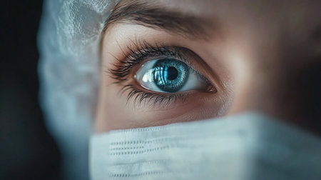 Intense close-up of a surgeon's focused blue eyes, partially covered by a mask and surgical cap under sterile lighting.