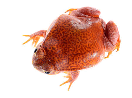 Big Red Tomato frog species of the genus Dyscophus (Dyscophus antongilii). It can be found in Maroantsetra city ditch. When threatened, and the tomato frog puffs up ITS points. Madagascar wildlife