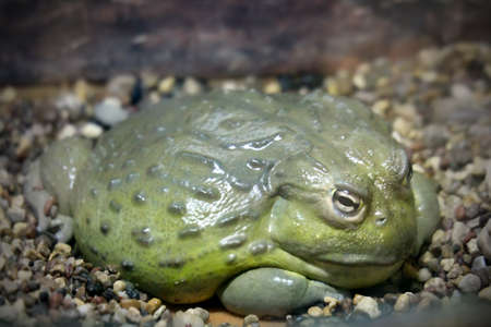 Close-up of an African bullfrog lying down on the ground. It was also known as the Giant bullfrog or the South African burrowing frog.