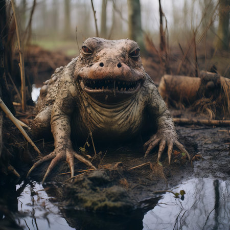 the monster, half-buried in the murky swamp, exudes an eerie atmosphere, its mysterious presence captivating the viewer. captured with a hasselblad x1d ii and an 80mm f/1.9 lens, set at f/2.8, iso 64, and 1/180s, this haunting image showcases the photographer's skill in conveying a sense of foreboding in the depths of the swampy wilderness. ai generated