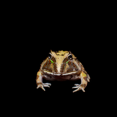 Close-up head Argentine Horned Frog or Pac-man, Ceratophrys ornata isolated on black background with reflection