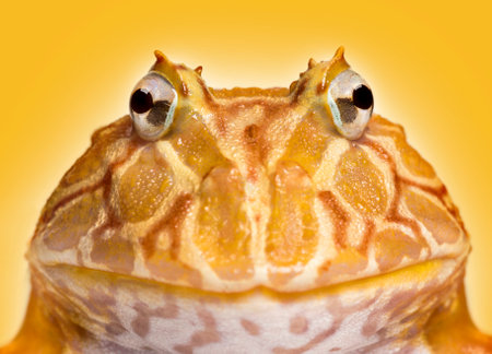 Close-up of an Argentine Horned Frog facing, Ceratophrys ornata, on a yellow background
