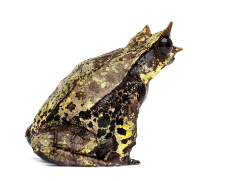 Side view of a Long-nosed horned frog, Megophrys nasuta, isolated