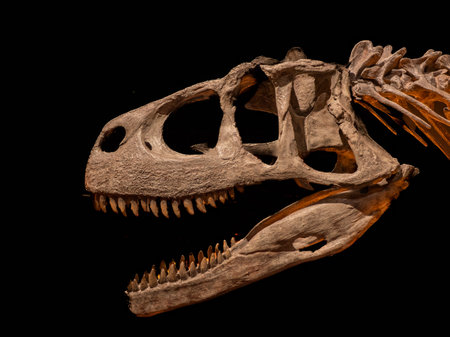 Dinosaur skeleton isolated on black background. Close-up of animal skull.