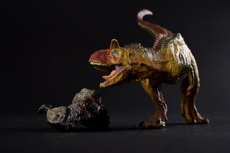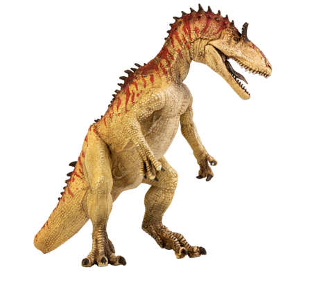 A worn out plastic dinosaur isolated on a white background. allosaurus