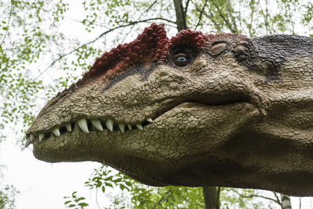 Close-up image of mean looking dinosaur in amusement dino park at Arboretum volcji potok near Radomlje in Slovenia.