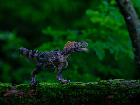 A predatory dinosaur with huge teeth among the ferns. A figurine of a dinosaur